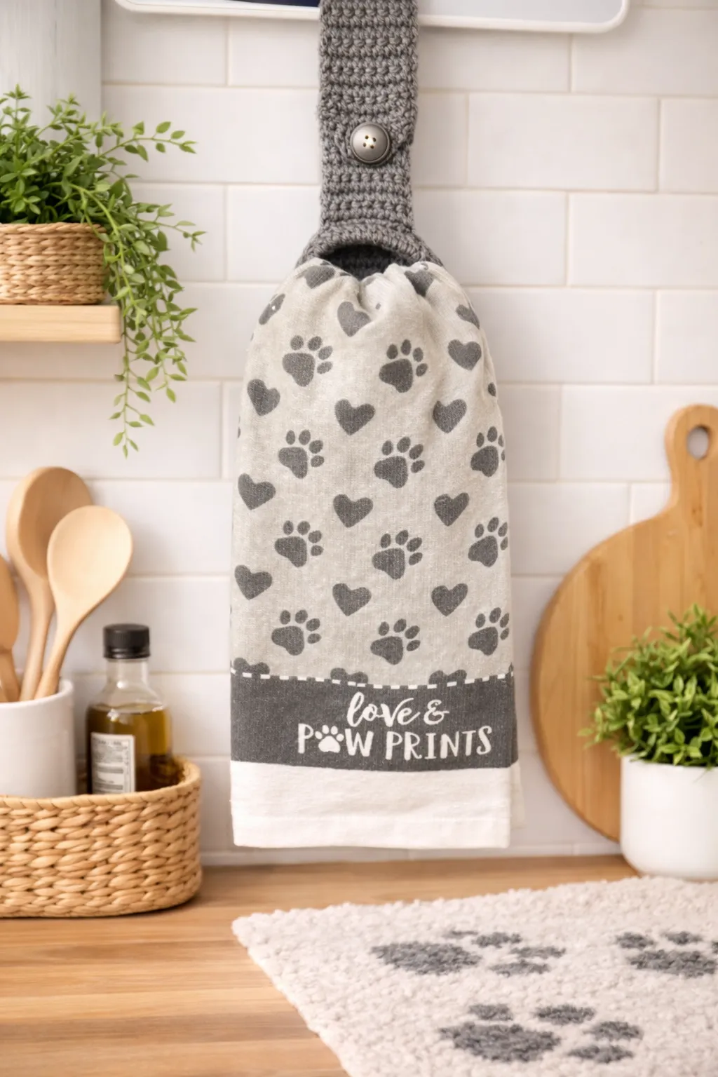 "Soft and absorbent kitchen towel in a neutral gray, featuring a charming paw print design—perfect for pet lovers and everyday use."
